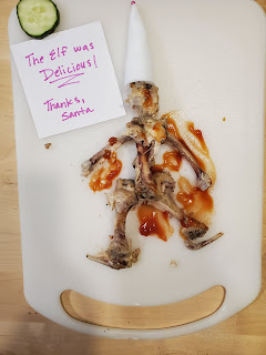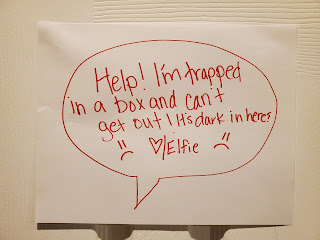 Our Elf was trapped in the crawlspace for a few days into December. Some of our family was out of town, so we're a little behind on getting the decorations out. Therefore, I made a note on the door to rescue him.